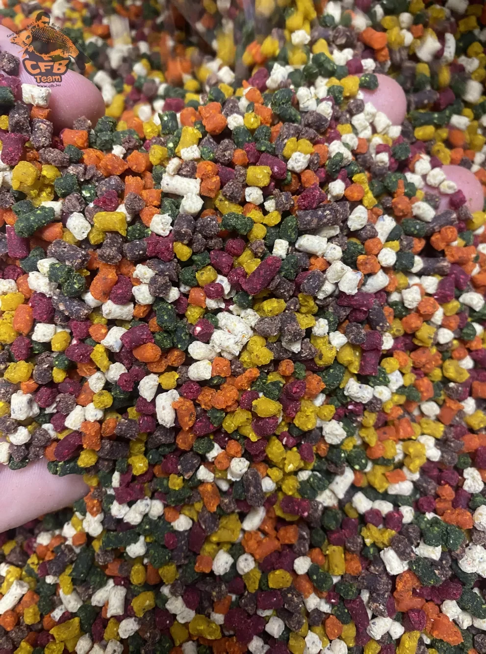- Hat különböző színű pellet egy keverékben, amely vizuálisan vonzza a halakat