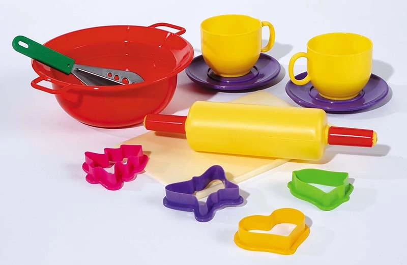 | Tartalom | Keverőtál, tésztanyújtó, kiszúró formák (virág, pillangó, szív, állat alakok), csészék csészealjjal |