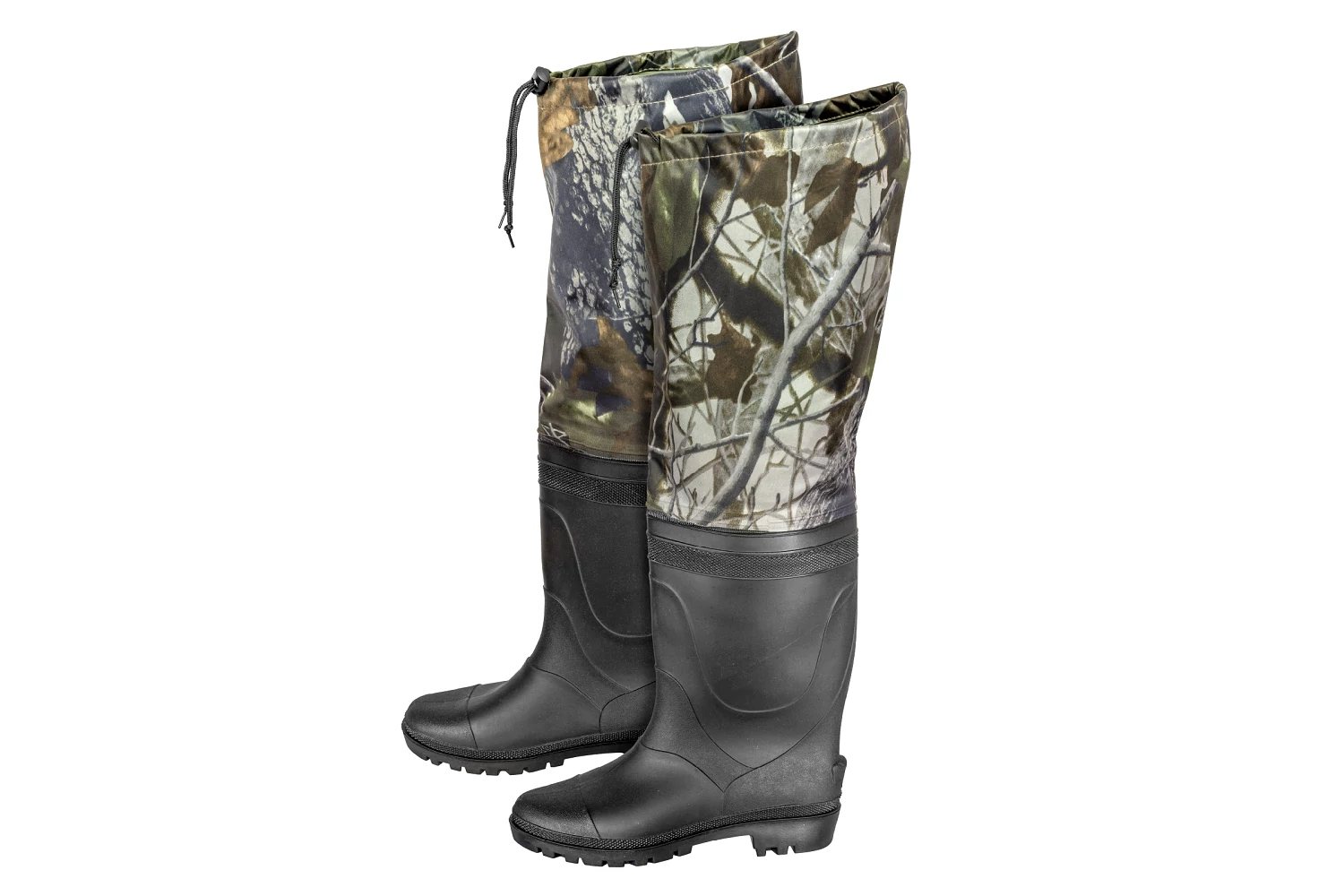 A térd felett rögzíthető, vízhatlan terepsszínű rész puha anyagának köszönhetően kényelmes viseletet biztosít, és igény szerint le is hajtható. A bordázott talprész biztonságos közlekedést tesz lehetővé csúszós talajon is, legyen szó akár sáros erdei ösvényekről vagy nedves partszakaszokról.