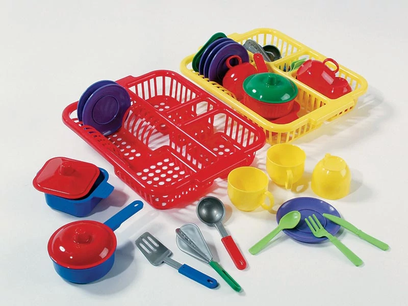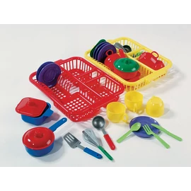 Ez a 17 darabos edényszárító játékkészlet minden kislány álma, aki szeret babázni és szerepjátékokat játszani. A készlet tartalmazza az összes szükséges kiegészítőt: színes poharakat, tányérokat, evőeszközöket és egy praktikus edényszárító állványt, amelyen a kis háziasszonyok "megszáríthatják" a babák és mackók számára használt edényeket.