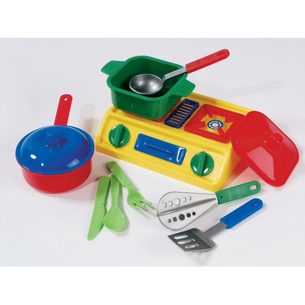 A mini konyha játékszett minden kis séf álma! A készlet egy színes műanyag tűzhellyel, két főzőlappal és komplett edénykészlettel érkezik, amely lehetővé teszi a gyerekek számára, hogy elmerüljenek a főzés varázslatos világában. A forgatható gombokkal ellátott tűzhely valósághű játékélményt nyújt, miközben a gyerekek megismerkedhetnek a konyhai eszközök használatával.